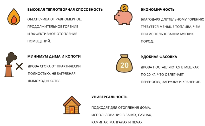 Заказывайте сухие колотые дрова твердых пород в мешках по 20 кг с доставкой по Москве, Московской области и всей России – и наслаждайтесь комфортом, теплом и приятным ароматом настоящего древесного огня.