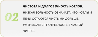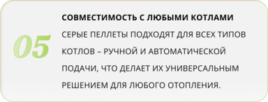 Благодаря высокой плотности и однородной структуре гранул, пеллеты равномерно горят, дают максимальную теплоотдачу и минимизируют расход топлива. Это делает их идеальным выбором для современных твердотопливных котлов, включая автоматические системы подачи топлива.