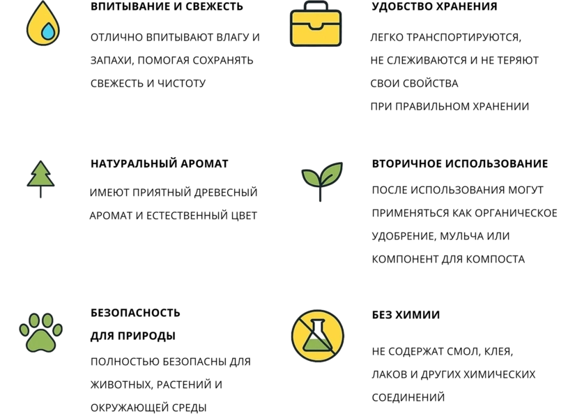 Для производства используется исключительно свежая древесина без лака, клея, красителей и других химических веществ. Опилки полностью безопасны для домашних питомцев, растений и человека. Они не вызывают аллергии, не пылят и не выделяют вредных испарений, поэтому их можно использовать даже в закрытых помещениях.